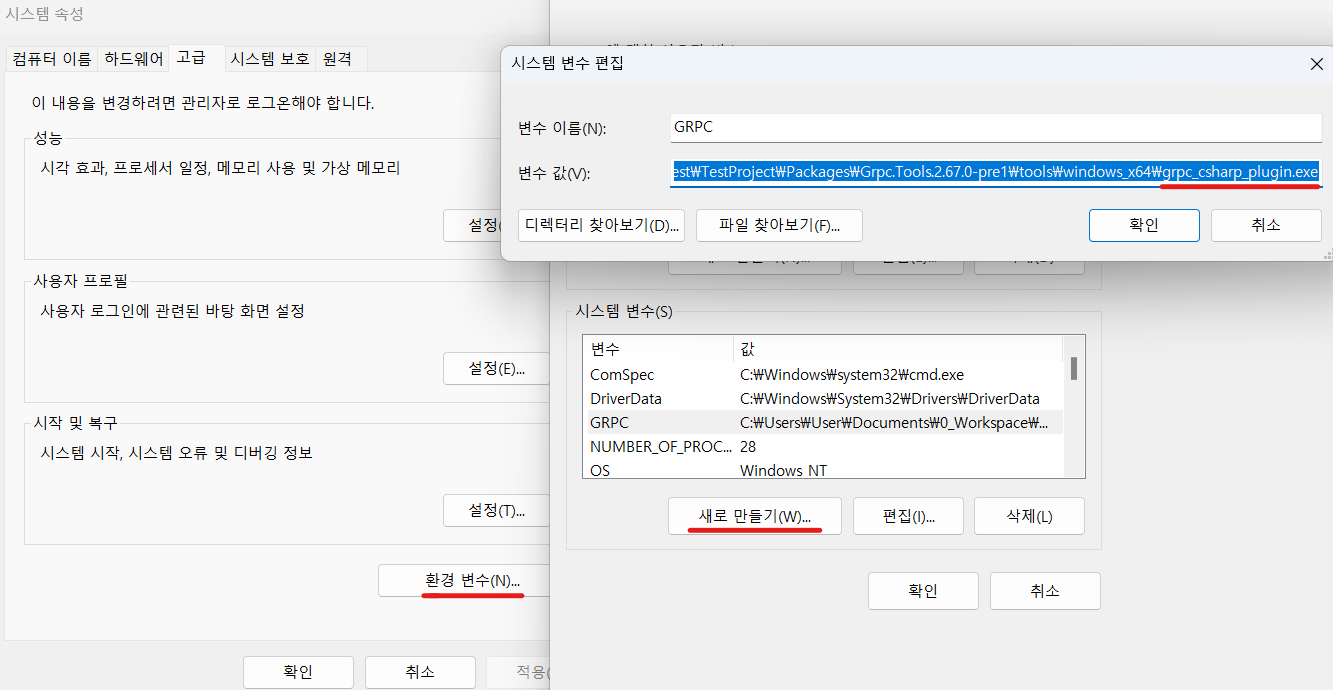 변수값 : (예시) C:\Users\User\Documents\0_Workspace\GameSchool\PROJECT\Test\TestProject\Packages\Grpc.Tools.2.67.0-pre1\tools\windows_x64\grpc_csharp_plugin.exe