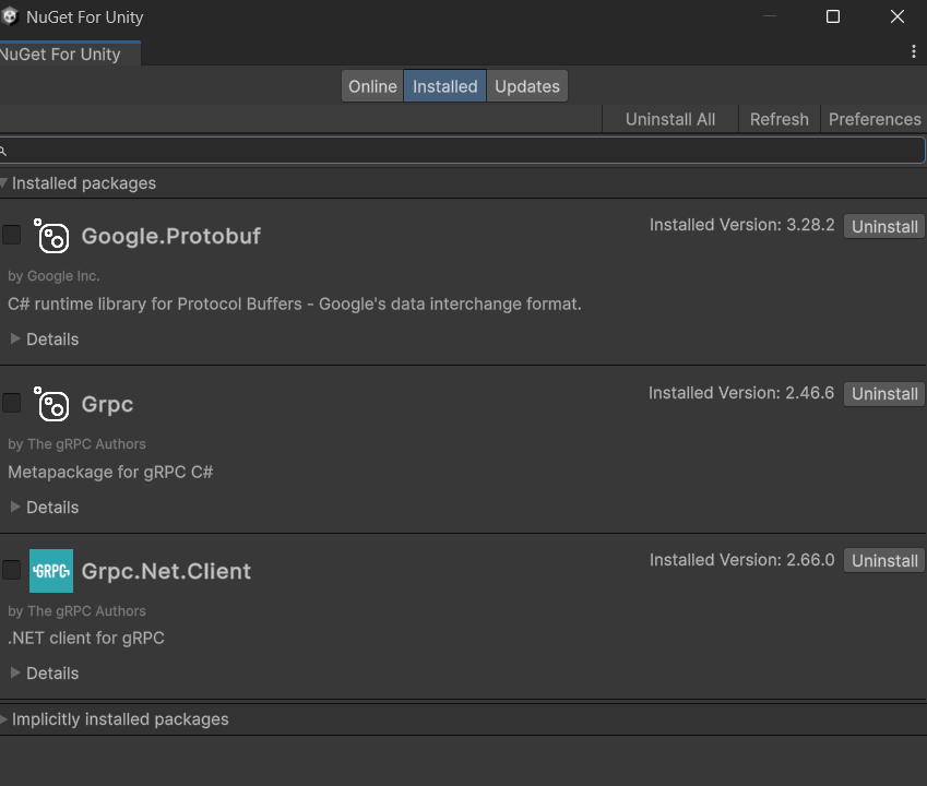 C# 스크립트를 생성하여 네임 스페이스에 'using Google.Protobuf;' 를 추가해보고 오류가 발생하지 않으면 정상 설치 완료.