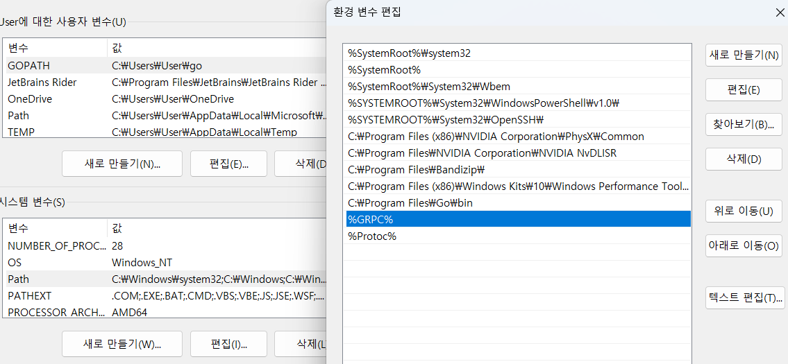 - 시스템변수 > 'Path' 편집 > 새로 만들기 > %GRPC%