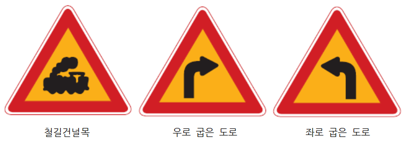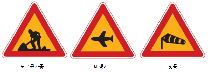 ▷주의표지 (붉은 테두리 삼각형 + 황색 배경 표지판)