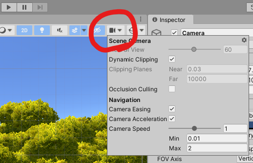 | - Field of View(FOV) : 시야각. 숫자가 커질수록 더 많은 범위의 모습을 카메라에 담게 된다. - Camera Speed : 카메라의 이동속도를 조정할 수 있다. |