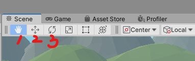 | ① 카메라를 이동시킬 수 있다. ② 오브젝트를 선택하여 Global 또는 Local(오브젝트 기준) 축으로 이동시킬 수 있다. ③ 오브젝트를 회전시킬 수 있다. |