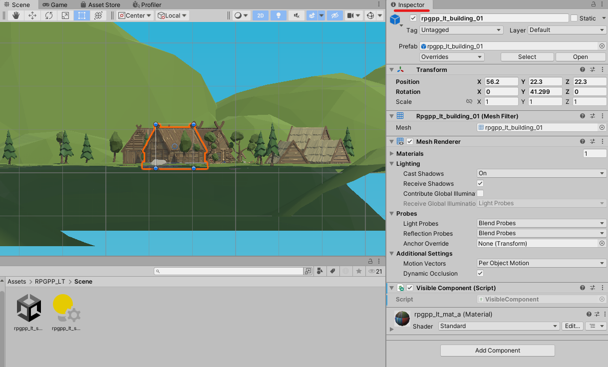 - 선택한 오브젝트의 속성, 즉 컴포넌트(Transform 위치/회전/스케일 정보, Material 재질 등)와 설정값을 보여준다.